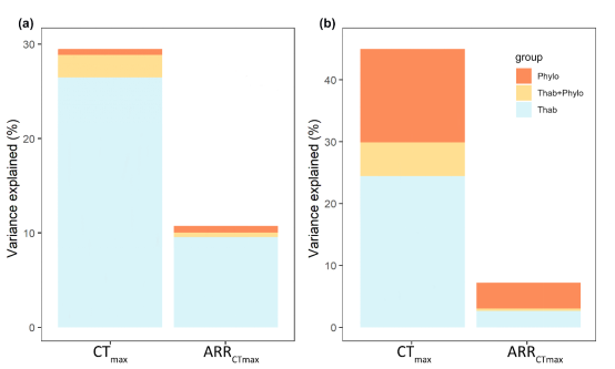 图2 方差分解分析(Variance partitioning analysis)揭示了系统发育惯性(Phylo)、物种热栖息地适应性(Thab)、以及系统发育结构适应(Thab + Phylo)对两栖类(左)和爬行类(右)耐热性和热可塑性的决定作用