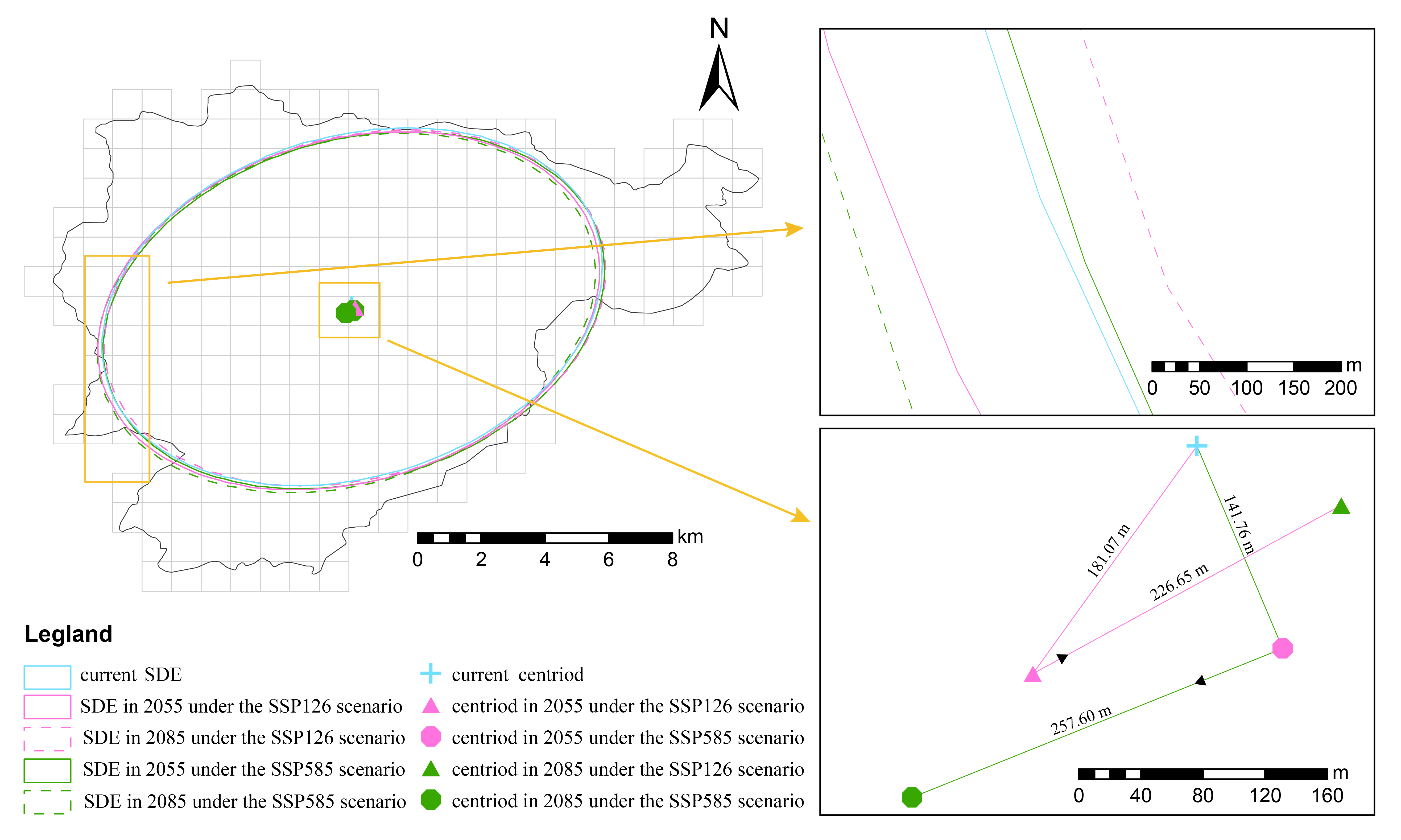图1 气候变化背景下峨眉山两栖动物栖息地适宜性指数分布的标准偏差椭圆及其质心迁移。