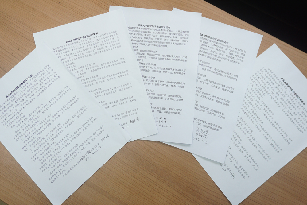 学院170多名研究生认真签署了学术诚信承诺书,郑重承诺恪守学术道德,抵制学术不端行为;遵行学术规范,严格遵守学术纪律;营造优良学风,树立严谨治学态度;崇尚求真务实,追求学术科学真知;倡导学术自由,营造良好学术氛围。
