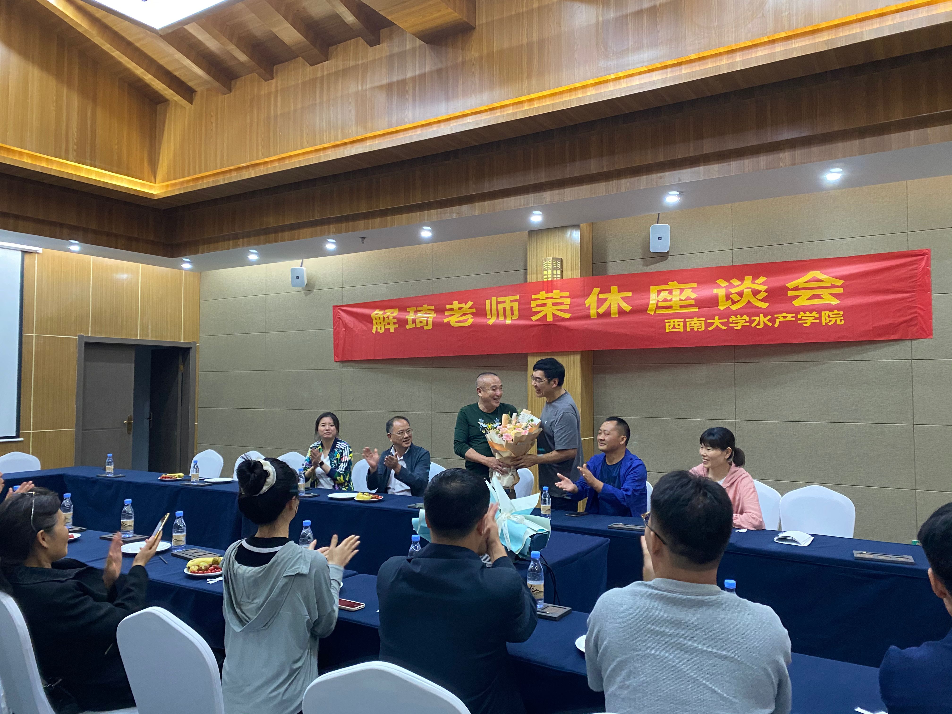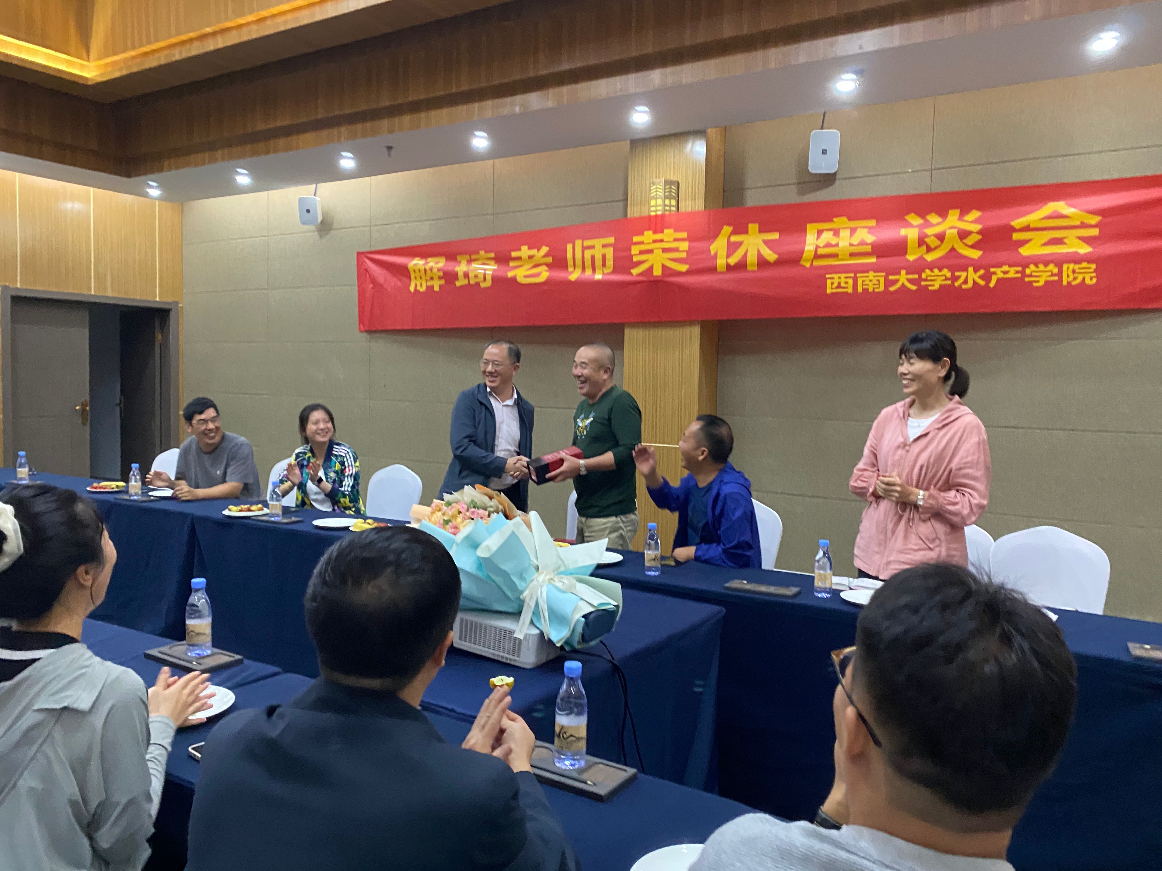 学院党委书记杨新斌代表学院高度评价了解琦老师为学科、学院建设发展付出的辛劳和做出的贡献,希望各位教职工继承和发扬解琦老师奋勇拼搏、吃苦耐劳的精神,不负韶华、接续奋斗,凝心聚力谱写水产学院高质量发展新篇章。杨新斌书记祝愿解琦老师退休生活快乐、充实,并希望他退而不休,一如既往地关心和支持学院的建设,为学院的发展出谋划策。