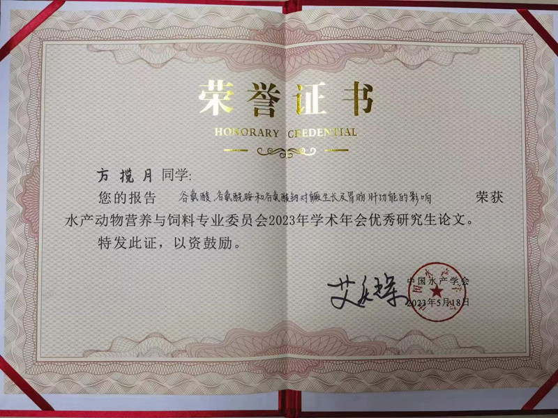 大会围绕“推动水产饲料行业的高质量发展”主题,设置大会主题报告、专题报告、青年学者论坛、研究生论坛和企业论坛。林仕梅教授代表团队做了“大口黑鲈雌雄生长与代谢差异研究”的专题报告,反响热烈。陈拥军副教授作为研究生论坛的评委、罗莉副教授作为专题报告主持人之一,受到好评。另外,罗莉副教授指导的两位硕士研究生方揽月和于俊琦被中国水产学会评为了本次会议的优秀研究生论文,其中方揽月在研究生论坛做的口头报告“谷氨酸、谷氨酰胺和谷氨酸钠对鳜生长及胃肠肝功能的影响”内容精彩,吸引产业关注。