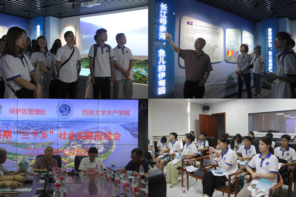 薪火相传,护佑大江鱼影。实践团一行来到江津区林业局长江上游珍稀特有鱼类国家级自然保护区重庆段宣教中心。重庆市珍稀特有鱼类国家级自然保护区管理处处长王维及干部段聪为水产学院师生上了一堂别开生面的宣教课。实践团以座谈会的形式与保护区管理处领导深入交流,切实加深了同学们对长江保护与珍稀特有鱼类保护的重要意义。长江是每一位保护区工作者的情感连结,上岸不离水!展望十年后的长江,大家无比期待长江得到了充分的休养生息之后重焕生机,长江生态系统逐步恢复健康,长江大保护的目标终于实现。到那时,说不定还能惊喜地发现,我们与“短暂告别”的白鲟又将相逢!