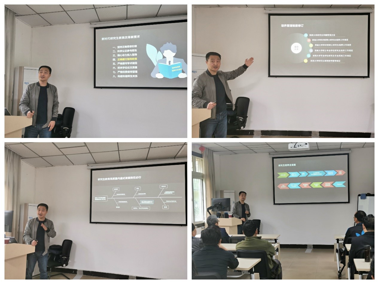 涂涛副院长分别从研究生培养新要求、研究生培养全环节管理、导学能力技术赋能三个方面进行分享。强调了新时代研究生教育改革新要求;解读了培养管理制度最新修订的六个最新文件并强调研究生教育高质量内涵式发展势在必行;着重分析了研究生培养的全过程的管理,明确指出研究培养的关键环节和导师们在整个过程中发挥的作用。