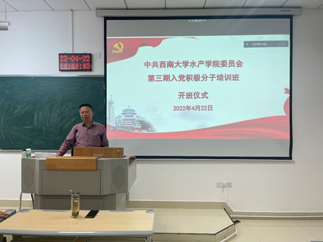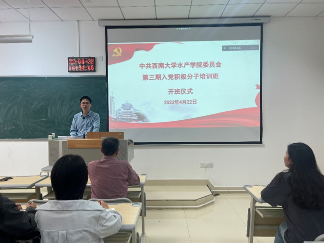 4月22日下午,水产学院第三期入党积极分子培训班开班仪式在荣昌校区7B212教室举行。水产学院党委书记、党校校长朱汉春,水产学院党委副书记、纪委书记、党校副校长穆奎,动物科学技术学院正科级组织员贺春湘,动物科学技术学院辅导员彭香,水产学院辅导员祁礽和来自水产学院、动物科学技术学院八十余名学员参加了开学典礼。会议由水产学院组织员陈博主持。