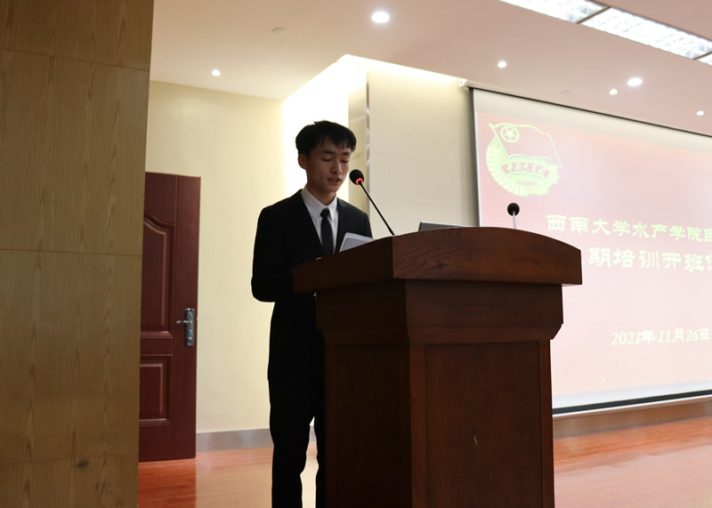 仪式在雄壮的国歌中拉开序幕。2021级水产类专业詹正昊同学代表第三期团校全体学员发言。他表示,团校是广大学生群体锻炼意志,提高思想觉悟的课堂,是广大学生群体学习共青团基本知识和先进理论思想的阵地,全体学员应以此为契机,认真学习理论知识,提高政治水平、职业素养和文化修养。