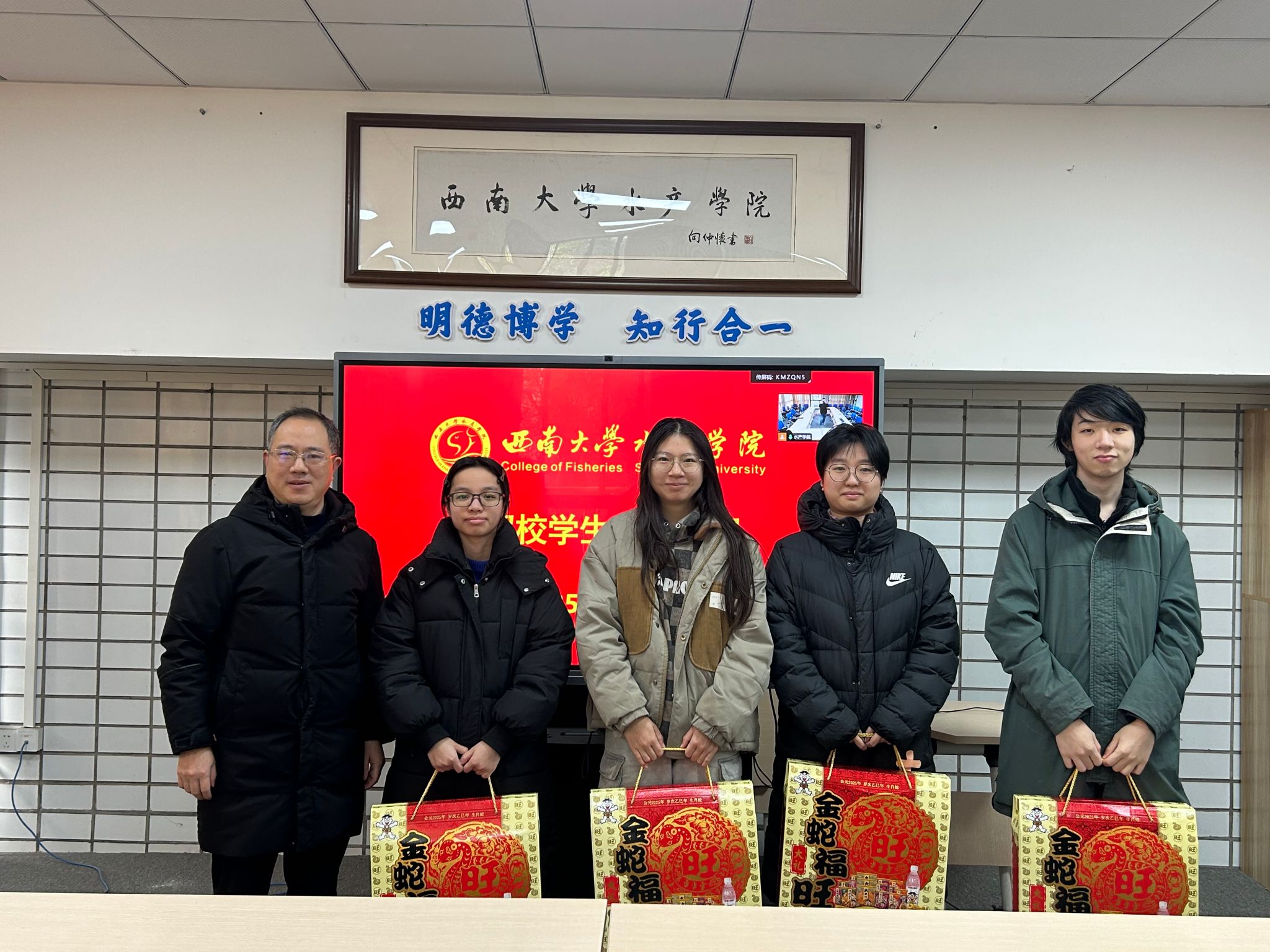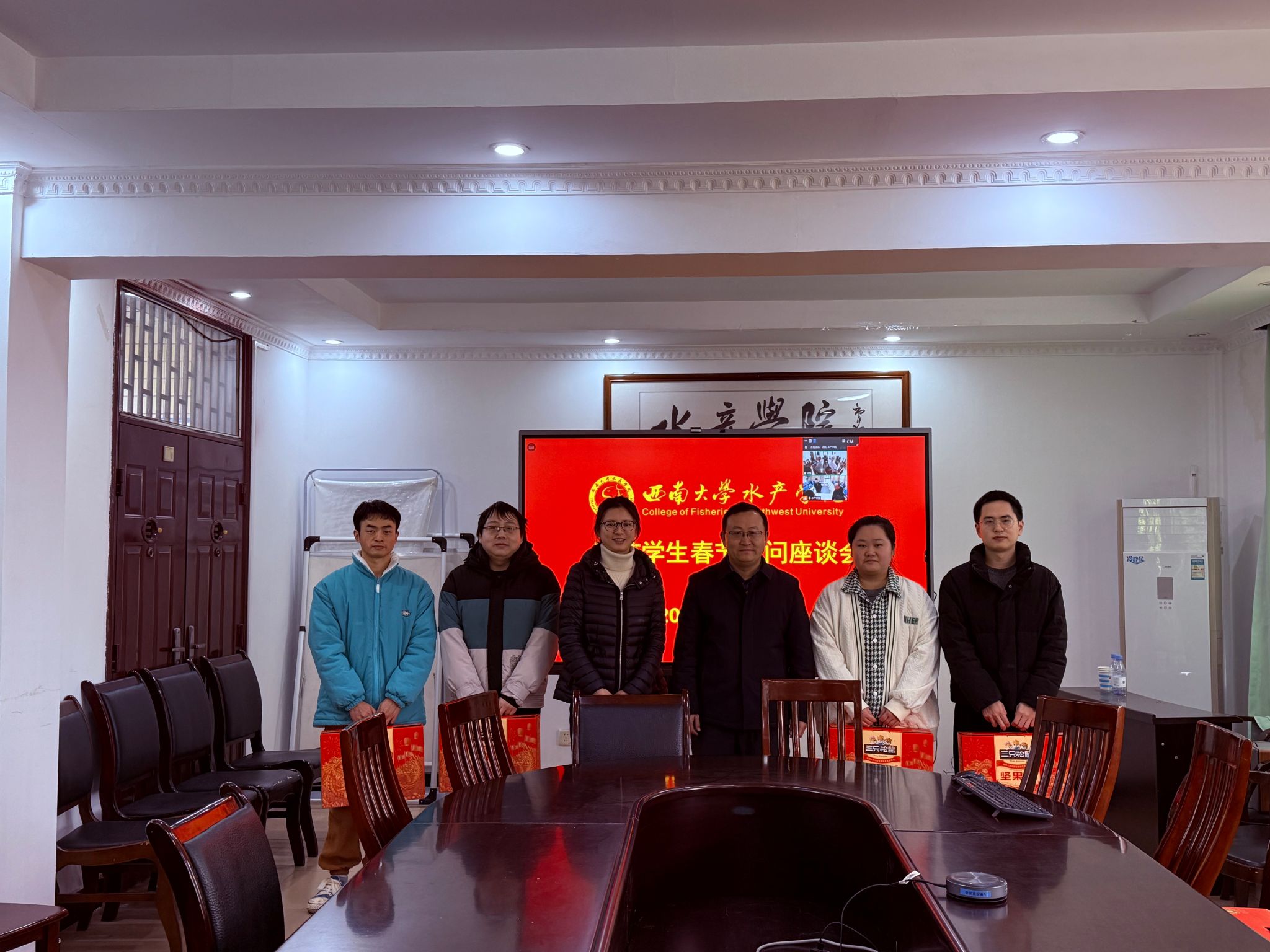春节的脚步日益临近,校园里处处洋溢着喜庆的氛围。2025 年 1 月 27 日上午,水产学院分别在北碚、荣昌校区学院会议室召开座谈会,对留校过年的学生进行了温馨的春节慰问。学院党委书记杨新斌、院长刘海平、党委副书记 纪委书记刘一丹以及本科生辅导员祁礽出席了此次活动。