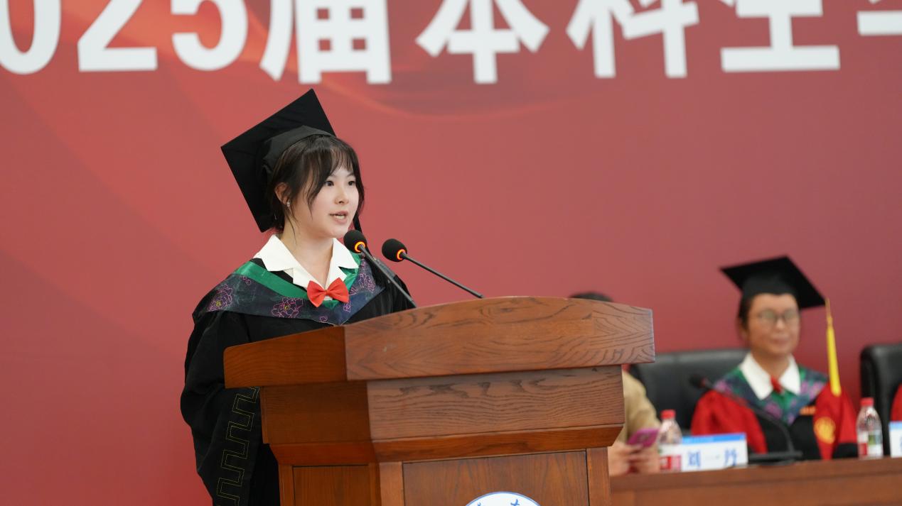 四载水产情,毕生水产心。毕业生代表何元兴上台发言。她深情回顾了在学院逐浪求知的岁月,把对同窗并肩岁月的眷恋、对母校及师长的深刻感恩,化作最诚挚的话语。