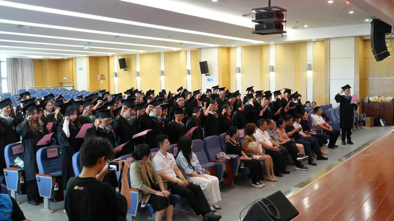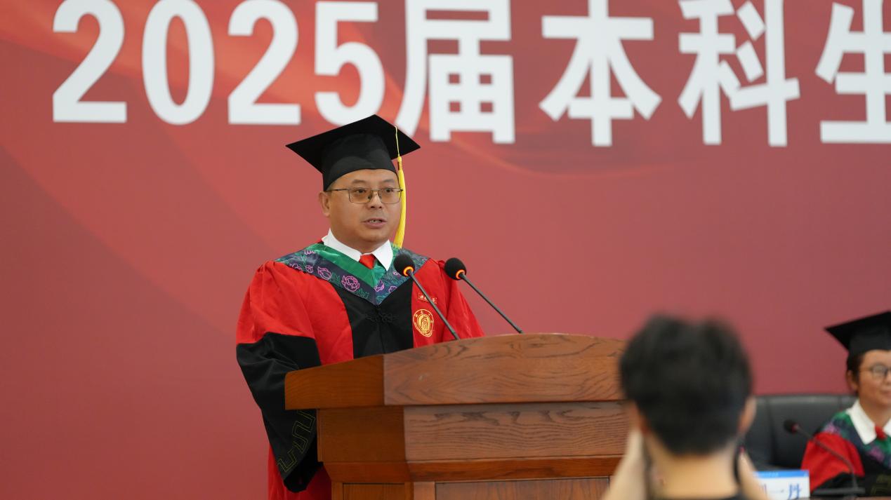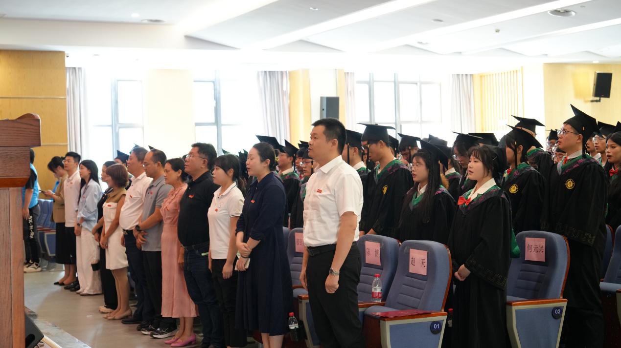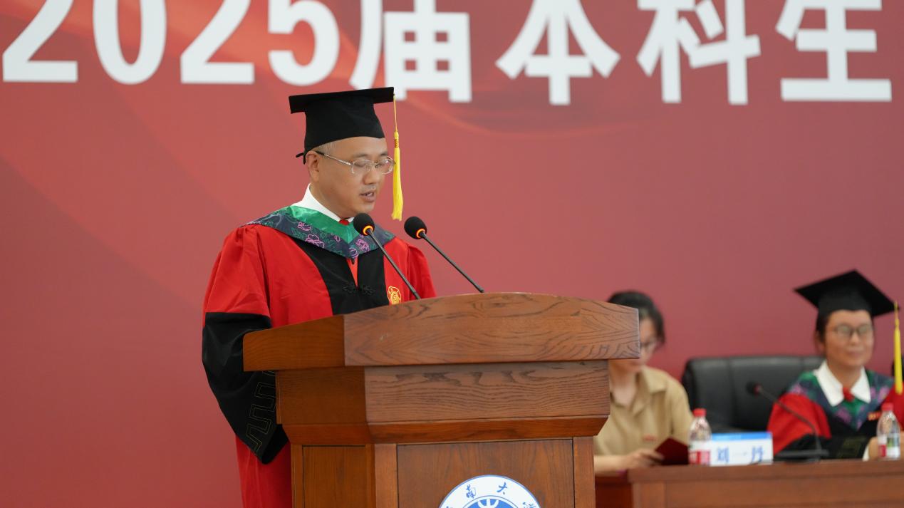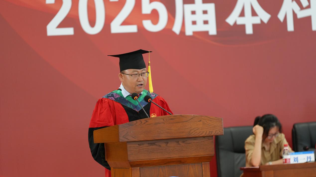 典礼在庄严的国歌声中拉开帷幕。学院党委书记杨新斌、副院长何文平依次宣读了2025届本科生表彰决定、毕业决定和学位授予决定。