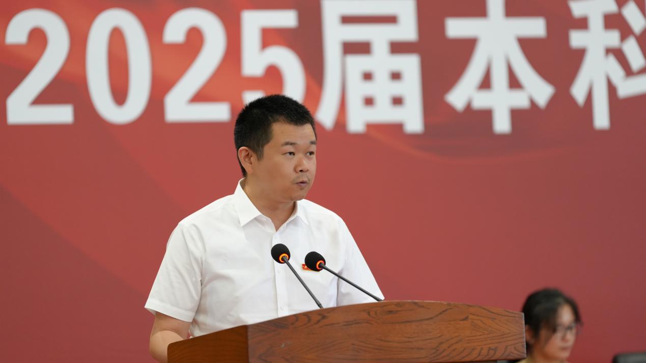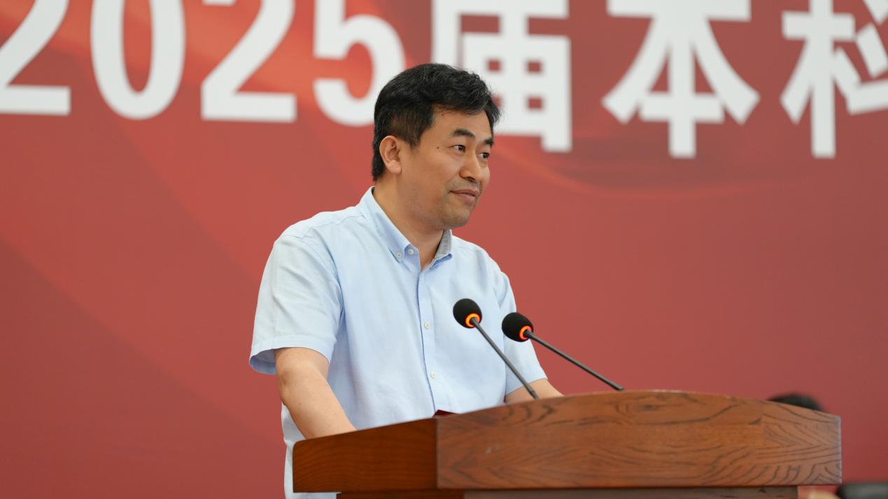 教师代表赵天老师发言。他望着台下一张张青春洋溢的面庞,寄语学子们要永怀探海求真的热忱,将个人理想与时代浪潮结合,勇担报国使命。