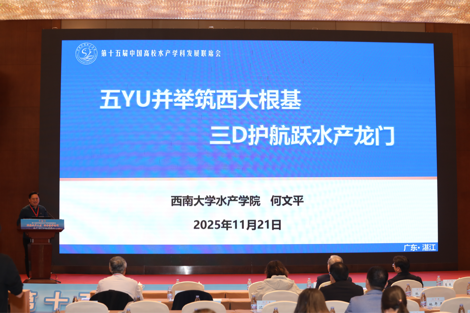 2025年11月20日至22日,由中国高校水产学科发展联席会主办、广东海洋大学承办的第十五届中国高校水产学科发展联席会在广东省湛江市隆重举行。本次会议以“赋能水产人才,服务海洋强国”为主题,汇聚全国48家高校及科研单位的180余名专家学者,共探水产学科发展新路径。学院对本次学科盛会高度重视,由何文平副院长带队,水族科学系主任周朝伟、学科秘书戴生飞一同赴会交流。