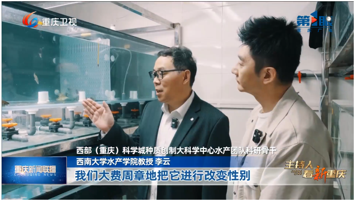 在此基础上,先后成功实现长江原种子代鳜的室内全人工繁殖,创制长江鳜原种子代性逆转XX伪雄鱼种质,再与正常雌鱼交配,成功创制原种子代速生“全雌鳜”苗种种质素材。2025年在betway西汉姆联校内繁育车间和合作企业分别实现长江“全雌鳜”苗种规模化繁育的突破。初步测试,全雌鳜苗种规格更整齐,摄食消化力强,生长速度比对照组快约30%,主要指标优于对照组。相关研究进展和成果已发表高水平研究论文10余篇,受到学界和社会的广泛关注,今年1月李云教授应邀出席“第四届三亚国际种业科学家大会”,在水产论坛作了鳜鱼种创的学术报告,鳜鱼成果两次在《重庆日报》报道,全雌鳜创制工作与本院刘海平教授相关研究保护工作一同接受重庆电视台第1眼新闻专访,在重庆卫视11月29日重庆新闻联播节目“奋进的重庆我们的“十四五”· 从舌尖美味到生命备份”播出采访报道(下图)。